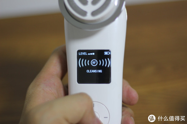 长按OK键开机,屏幕上显示当前电量和工作状态,通过方向键可以调节强度和工作模式,不过全是英文的,不看说明书就搞不懂怎么回事儿了。