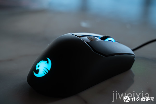 前文提到这款鼠标虽然只有两处发光区域,但是LED的处理也是符合水准的,透光十分均匀不刺眼,并且搭载了ROCCAT AIMO灯效,在桌面搭配其他ROCCAT设备进行灯效联动就更能体现出光污染的感觉。