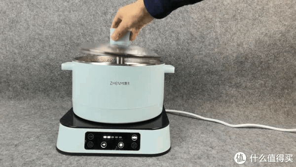 刚才提到了锅盖的超大把手,其实,除了起到容纳顶起的升降杆,在煮火锅时,厚手柄的作用也可以起到很好的防烫功能。