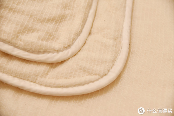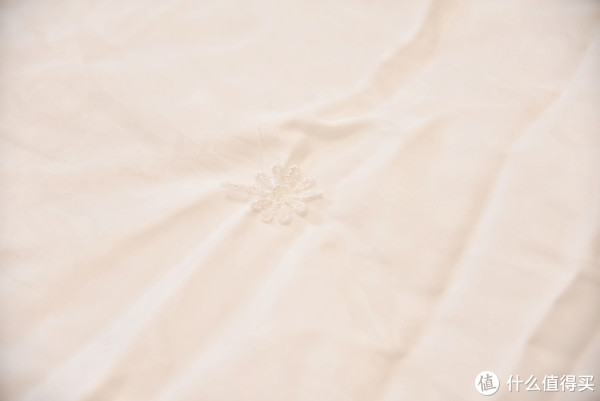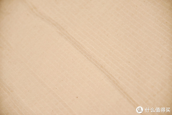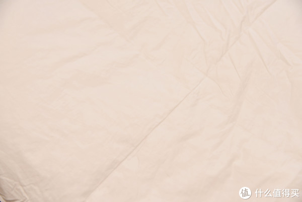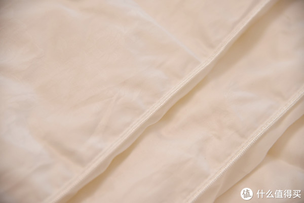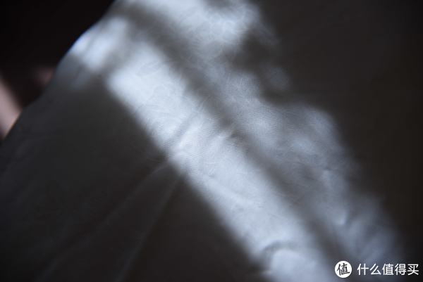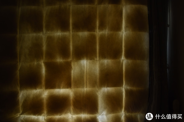 ;而蚕丝被因为我选择的是长丝绵的,所以均匀度也不错,透光度也比较好;羽绒被是透光度最好的,因为被挂起来填充物多少有点靠下,但是即便是很厚的位置,依然可以透出光线。这里值得一提的是,因为羽绒被是一定要有分隔的,但是在分隔线的位置透光情况并不是很严重,也是一个偏暗的情况,这和这款羽绒被特殊的分隔方式有很大的关系,可以保证在分隔的位置也不至于完全没有填充,而是在里外进行互补,这样可以保证优秀的保温性能。