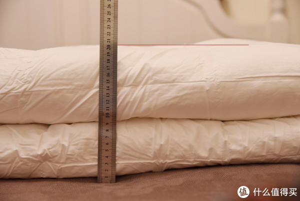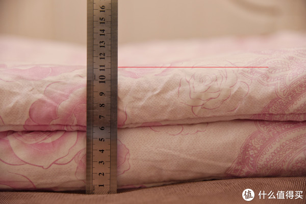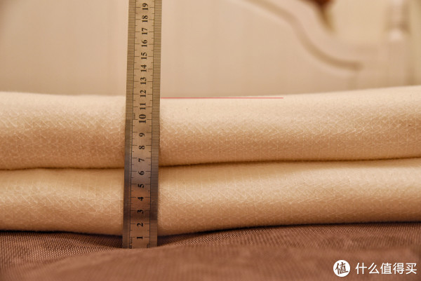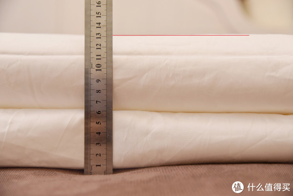 之前说了,蓬松度其实也就基本代表了被子的保暖性,那么同样尺寸下使用的不同填充物的被子,在蓬松度上有什么区别呢?具体来测试一下,这里的测试方式很简单,我将同样尺寸的四款被子,两次对折后,测量其厚度,这样就能直观的说明哪款的材质更加蓬松了