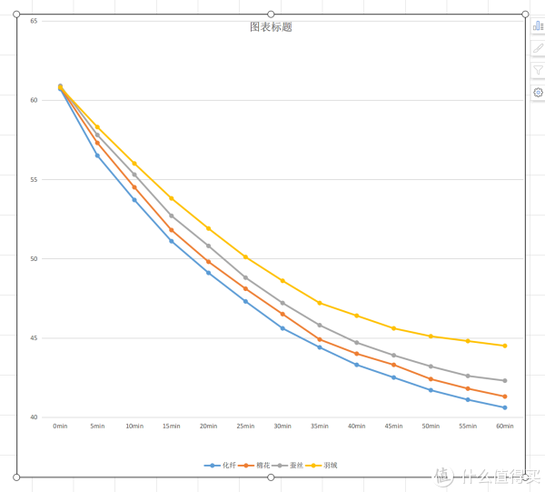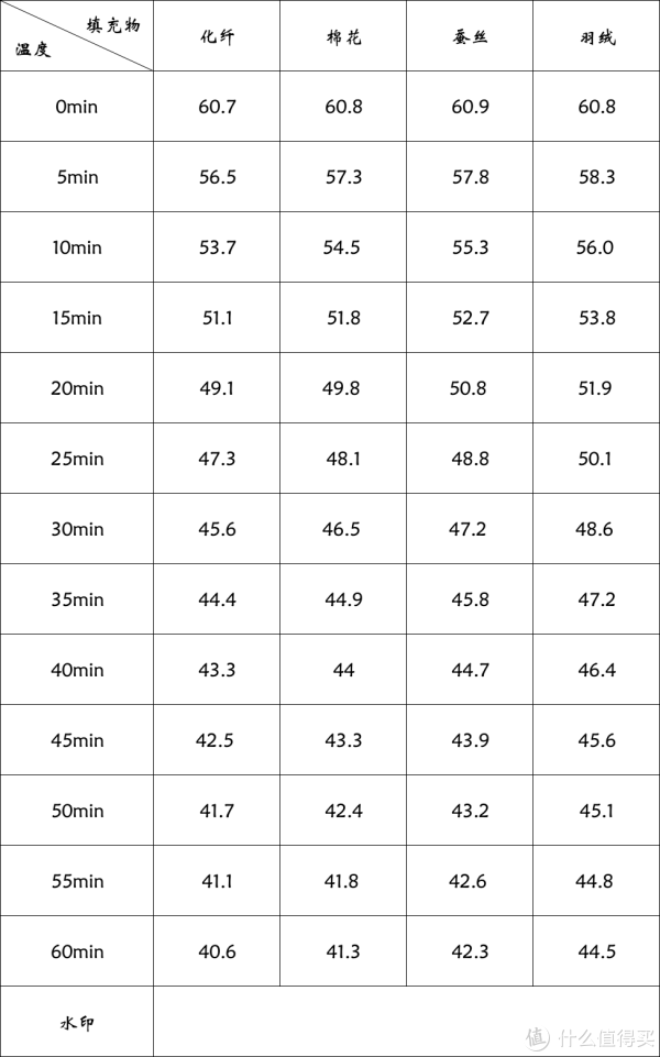 说一下结果吧,从保温能力上看:羽绒被>蚕丝被>棉被>化纤被。这个结果和之前测试的蓬松度相符,可见通过蓬松度判断被子保温能力也是有一点依据的。对比保温性能最好的羽绒被和最差的纤维被,经过1小时温度差达到了近4℃,这个差别实际已经很大了。从曲线上看,刚放入被子的热水袋在前5分钟是散热最快的,这和被子刚开始是室温需要吸收更多热量以达到平衡有关系;后续的曲线逐渐变平缓,在温度降低到45℃以下时,降温变得很慢,尤其是羽绒被,在45℃后,每5分钟仅降低0.3℃,如果是体温的情况,保温的效果应该会更好。