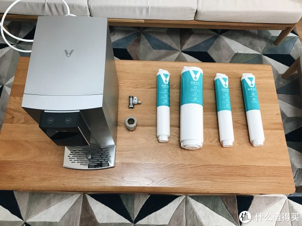 其实拿掉包装之后,产品的集成化做的还是不错的。除了机器本身之外,还有需要使用的四支滤芯、以及三通球阀,以及32mm宽的水槽套。