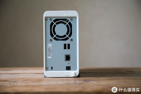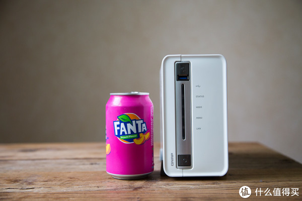 应该很多用户都会选择入门的2盘位NAS,一是价格便宜、二是对于一般用户2盘位的空间级别可以满足一般家庭用户的需求。对比一下芬达的大小,还是很mini的。白色对于融入家居也是个不错的选择,我一般也都把NAS放到电视机前面。
