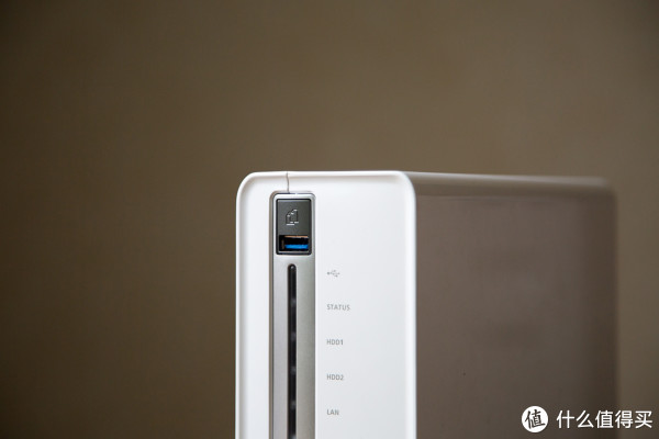 正面还有一个前置的USB3.0接口支持一键备份USB设备里面的内容。正面还有像是电源、硬盘、网络指示灯。
