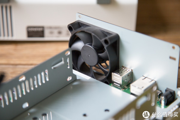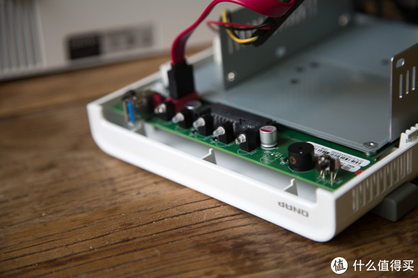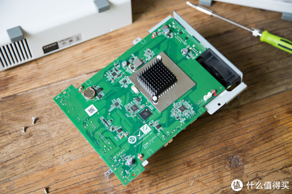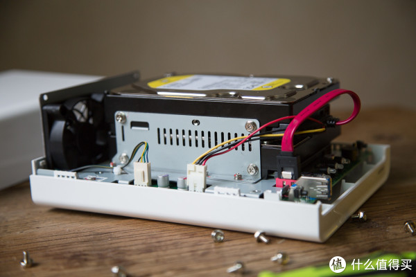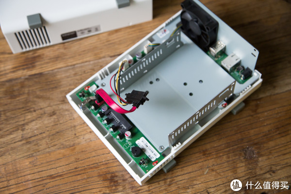 打开后就看到NAS内部了,硬盘需要采用螺丝固定。虽然不支持热插拔设计,但是我真没见过有没事给NAS做硬盘热插拔换盘的。
