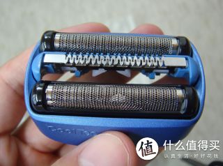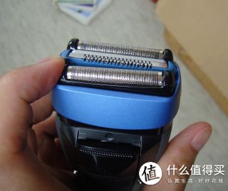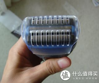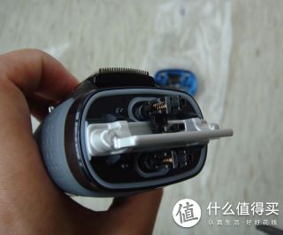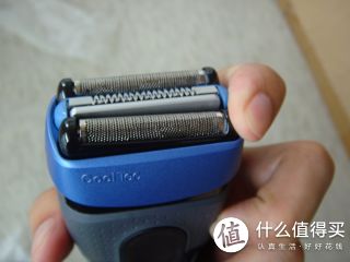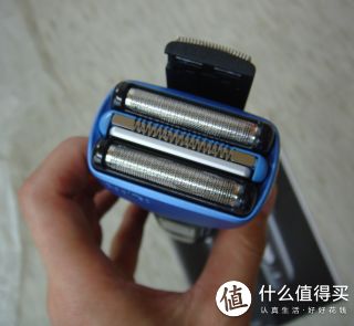 再来看看刀头,三刀头,中间那根是冰感条,中间的刀头是个类似剪子的作用,主要是把长胡须剪掉,否则两边的刀头是没法刮胡子的。也就是说,长胡子通过中间的刀头剪短,两边的网状刀头负责深层次刮干净。