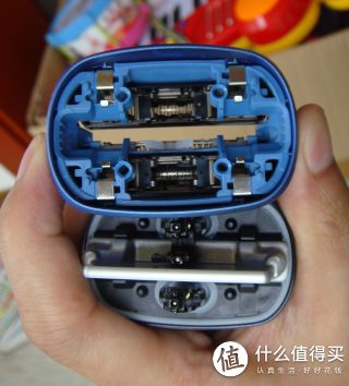 把刀头取下后,中间就是冰感舒缓条,两边是带动刀头往复移动的联接头子,看出连接头子上的弹簧没有,这个弹簧就是起到能够让刀头上下浮动的作用。