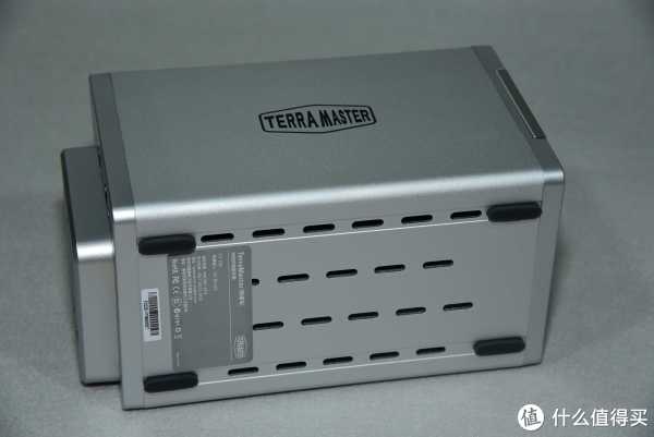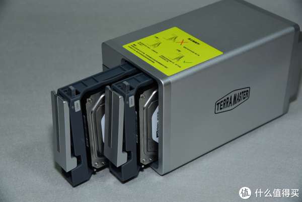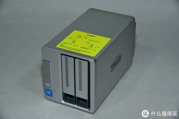 铁威马的F2-220整机为铝合金外壳,双盘位和指示灯采用了纵置式布局。前面板左侧为指示灯,右侧为两个硬盘笼,面板顶部为操作说明指示。