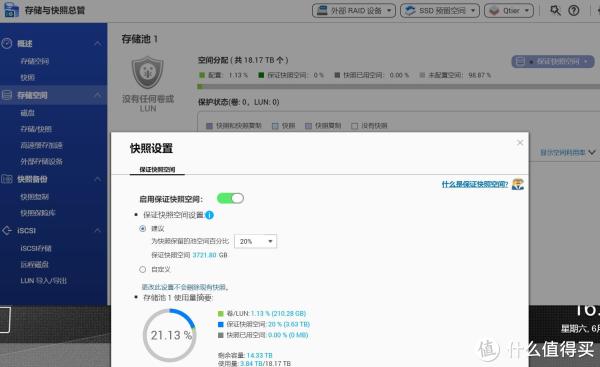 10、快照设置,我也看了半天,总之,威联通的学习成本要比群晖高很多,每个功能都有一些选项,一些名词,俺建议不懂的朋友,还是默认吧,俺也不懂: