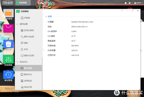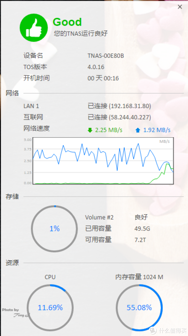 当然,在TOS系统界面上,还会随时显示NAS的运行监测表,以方便用户随时对NAS的状态进行了解。