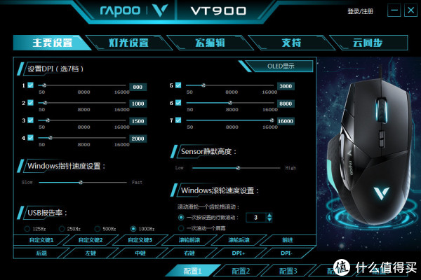 在主要设置版块里,可以设置DPI,而且一共有7个档位可以选择!即:800/1000/1500/2000/3000/8000/16000,它的步进为50。这个板块的设置选项还是比较多的,比如,可以调节指针速度、静默高度、滚轮速度以及UBS报告率。并且还可以设置按键的自定义,这款VT900多达12个按键,可选择性很大!