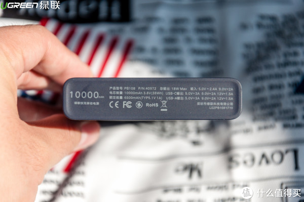 在绿联Type-C移动电源的底部标明了移动电源的输入、输出功率、电芯容量以及额定容量等产品信息。从数据可以看出其反向输入最大支持9V 2A的18W的快充,同时USB-C和USB-A应该都支持QC3.0的快充。