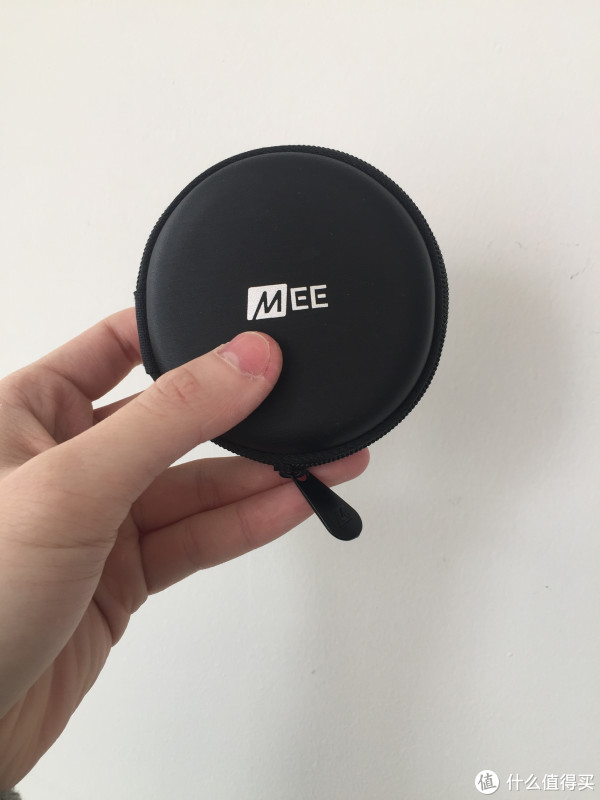 随耳机附送的收纳盒,圆形,比较普通,但也好用,黑色印有银色“MEE”标志,不糊弄。