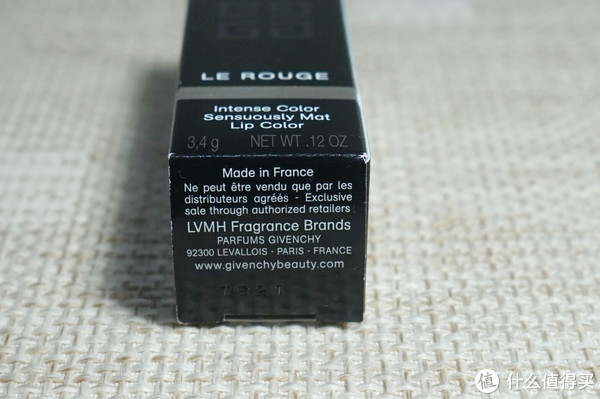外盒正面的下方写着口红的重量是3.4g。外盒的底部注明了产地是法国。上面还有产品批号。