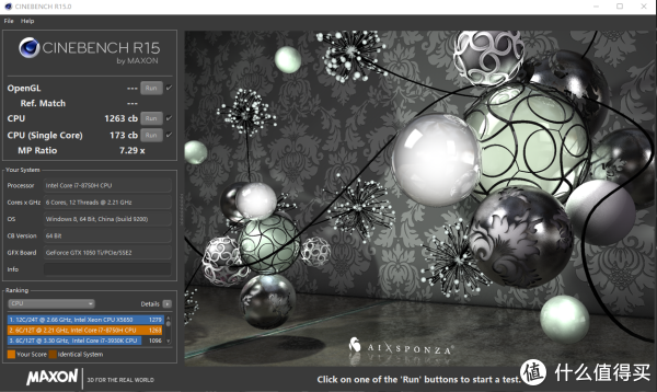 CINEBENCH R15 单核跑分173,多核1263,图片左下角排行第二,这都不重要