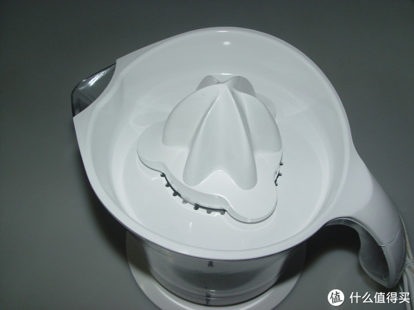 锥形榨汁头,设计的比较大,国产橙子也挺合身的。只能榨橙子、柠檬、胡柚等,一切两半,按在上面,锥头会自动旋转,如果手松开时间稍长一点再按下,就会反方向转,如此交替。接渣盘比CJ3000高一点,但如果榨满一壶,可能中途还是要倒一次果肉渣。