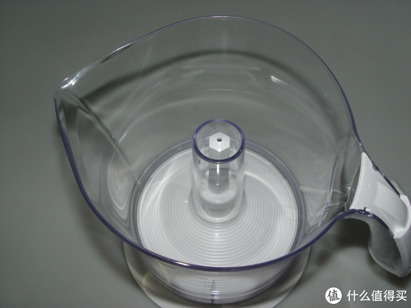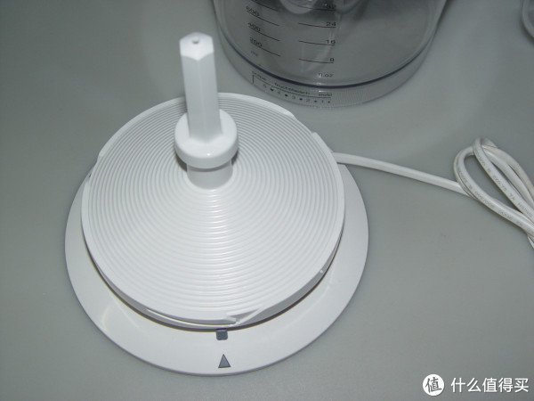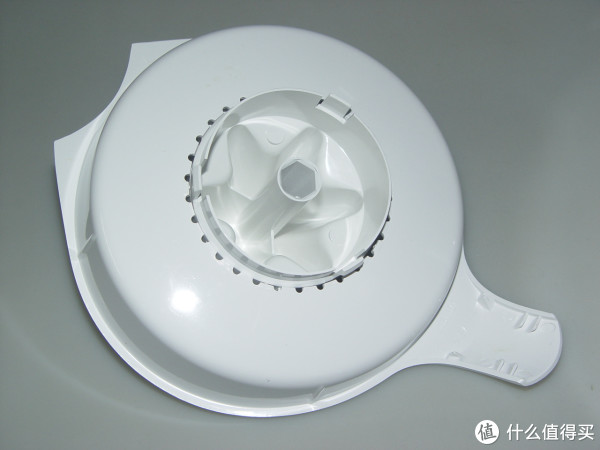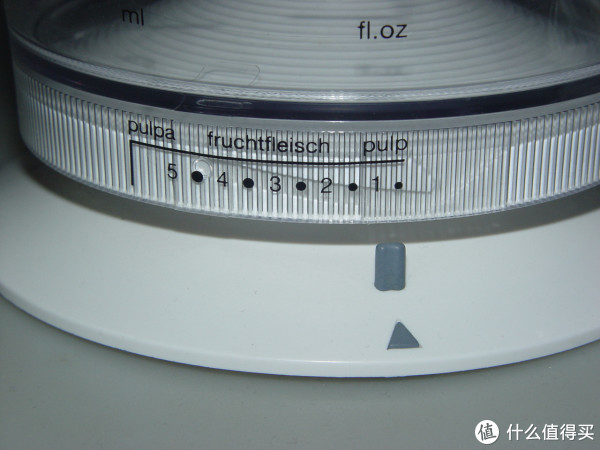 接渣盘上这一圈半圆孔和椎体的间隙就是过滤果肉残渣的,同时也起到撇去泡沫的作用。果汁浓度调节的原理就是转动杯体,改变杯体与底座的高度,从而减少或增加接渣盘与榨汁头之间的间隙,这样就能过滤果粒或让更多果粒漏下去。