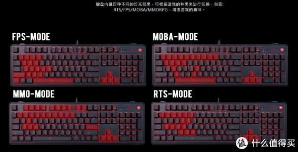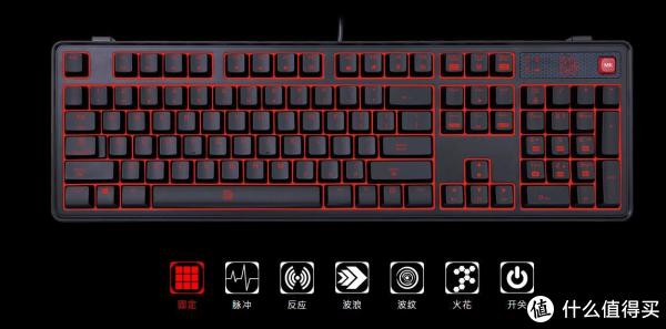 在灯效上,相较于TT RGB灯光机械键盘星耀X1,TT 创世战车这款定制键盘可能由于是采用单一红色LED背光灯的关系并没有太多类型,只有7种,分别为固定、脉 冲、反应、波浪、波纹、火花、开关等七种。除此之外,还只预置了四种游戏灯光效果,包括: RTS/FPS/MOBA/MMORPG,可根据游戏的种类来进行切换,个人认为这算很实用的一种设置。具体效果可看下视频,画质一般,仅供参考。