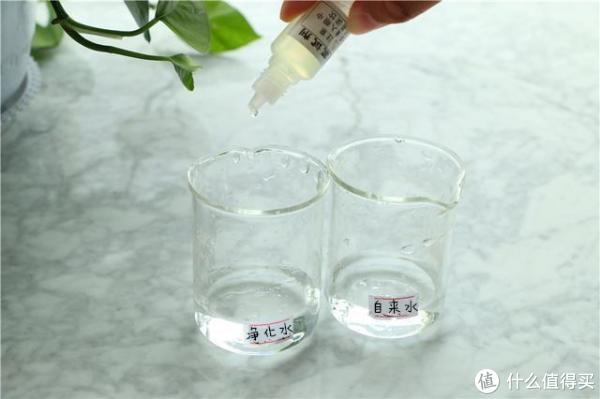接下来就进行一下余氯测试,看使用九阳净水器R7s净化后的水质是否将有害物质真正的去除掉呢?依旧取两杯相同容积的净化水和自来水,在每一杯中滴入3滴余氯试剂,有余氯的水质会呈现黄色,没有则无变化。