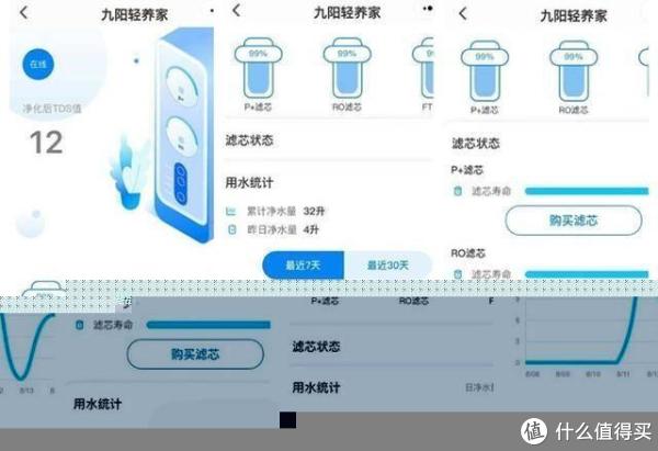 前面说到这款九阳净水器R7s支持联网,不过无需下载APP软件,只需要通过九阳小程序“九阳轻养家”就可以实现互联。可以看到在小程序中中,可以监控滤芯的使用情况以及用水统计,当然也可一键购买滤芯,非常方便和实用。