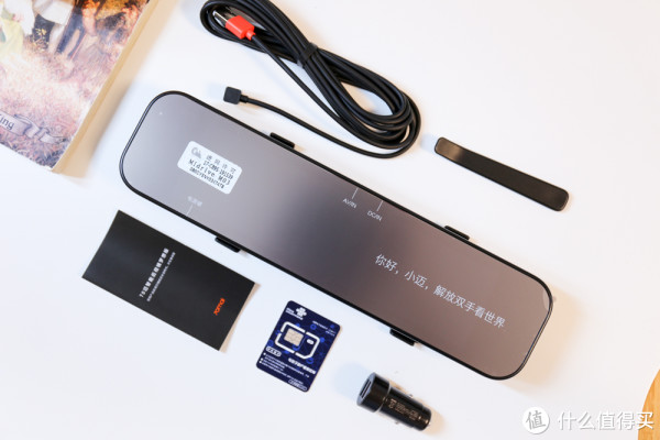 先来看一下整个包装中都有一些什么东西。我们看到,除了后视镜之外,还包括了一根2.5米长的电源线(Micro USB接口)、两口车充头、走线撬棒、固定绑带、中国联通的物联卡(SIM卡)、说明书(内含三包凭证)。