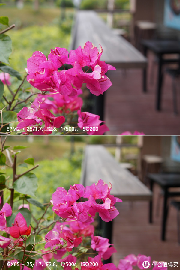 这张图冬天中午多云天气拍的,其中EPM2色彩更鲜明,草地更绿、花朵更红,而GX85比较素淡。相对来说我更喜欢奥林巴斯的风格。
