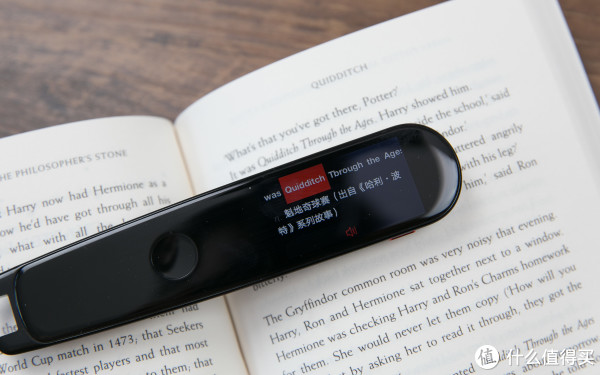 动图被压缩可能不足以清晰的反映扫描质量,再通过一张图片说明一下。《哈利·波特》书中对一些词句采用斜体艺术字印刷,例如图中的"Quidditch Tbrough the Ages", 有道词典笔2.0不但做到了完全正确的识别(艺术体的h印刷的非常像b),而且单独点击Quidditch的话,还注明了出自《哈利·波特》,也充分反应了收录内容的丰富性。