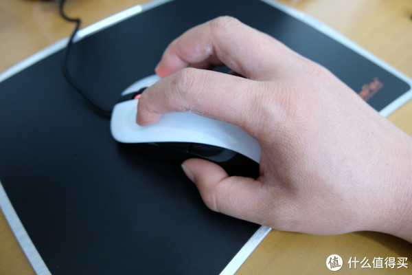 在握持手感方面的体验,楼主手长19cm,给大家一个参考,个人觉得Rival106的体积比较适合趴窝,41.5mm的鼠标高度对于掌心支撑也刚刚好,不像Rival600那样太拱手的感觉,左侧裙的中部有一定的凹陷,对于大拇指是非常友好的,不管是趴窝或拿捏都增加了握持手感的舒适度,在使用中也方便按动上方的两颗功能按键,在实际的使用中侧裙的塑料质感也不会显得滑手,左右主按键的20M微动手感按键清脆,回弹有一定的反馈感▼