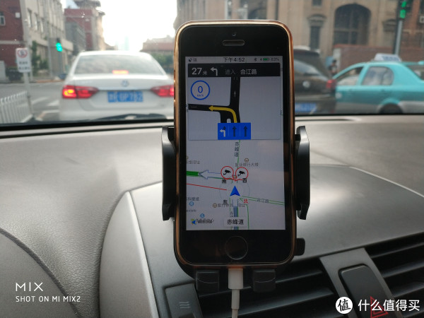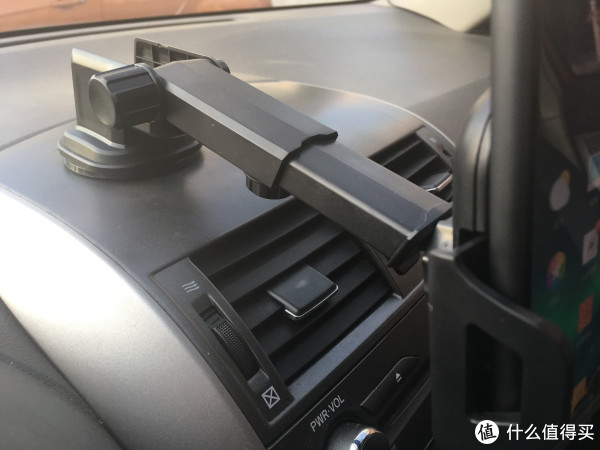 组装完支架赶紧放在车上试试,按照卖家宣传图把吸盘粘在中控上,锁扣按到最下面就可以了