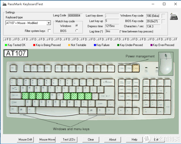 通过软件测试,该键盘支持多按键无冲设计,人的手指一共十只,除去一般仅按空格键的大拇指之外,八个按键一起按下均可识别,全键无冲也可以做到