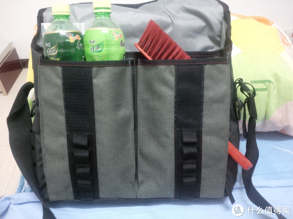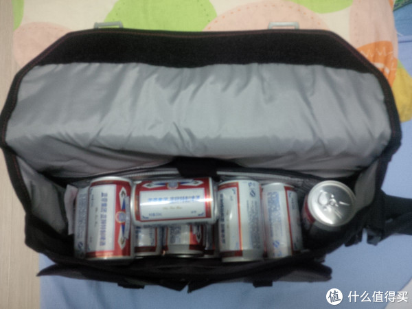 背部的拉链,不是单独的隔层,是直通包内的,可以方便拿到笔记本。还可以发现,包包的提手也在偏后位置,从包包正面甚至很难看到,那24个易拉罐实际提在手中并没有发生偏重偏坠