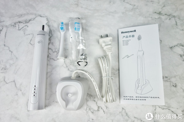 好啦,给大家看一下全家福。1支手柄,牙刷头2支,充电器1个,说明书,一目了然。