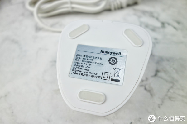 手柄底部是无线充电定位孔,标注了IPX7字样,霍尼韦尔HR2-R480W声波电动牙刷具备IPX7 防水可直接冲洗。