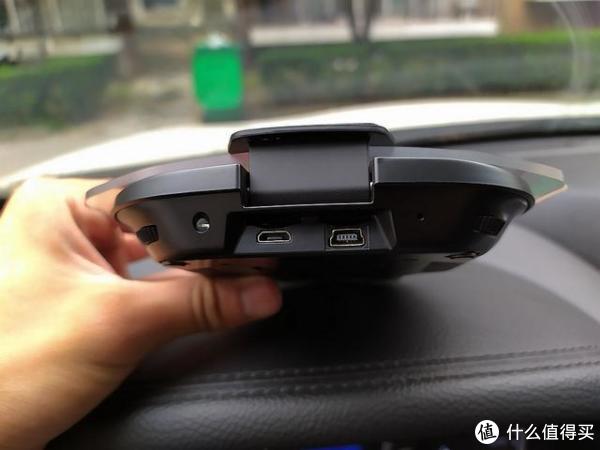 机身上顶部是车萝卜智能HUD蓝牙版插口,一个是电源插口,一个是扩展插口,需要注意的是车萝卜智能HUD蓝牙版必须通过汽车的OBD接口才能通电,旁边的或者接口是不具备通电功能的,可以看到旁边还有个小灯,那个则是光线传感器,它可以根据车内的光线环境自动调节HUD设备投射的光线亮度。插口的对立面,也就是我们驾驶员的这一端底下有四个按键,从说明书上了解的是重启键、亮度调节功能。