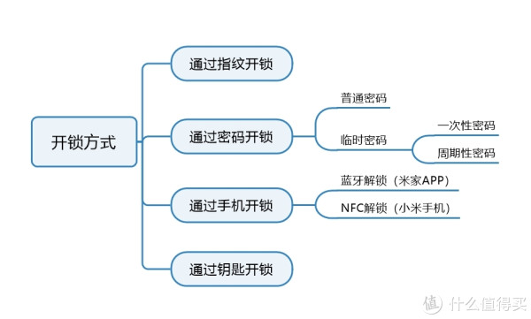 官方宣称拥有6大开锁方式,分别是指纹开锁、普通密码开锁、临时密码开锁、小米手机NFC 开锁、手机蓝牙开锁、钥匙开锁。对此我总结了一下,做了个图如下: