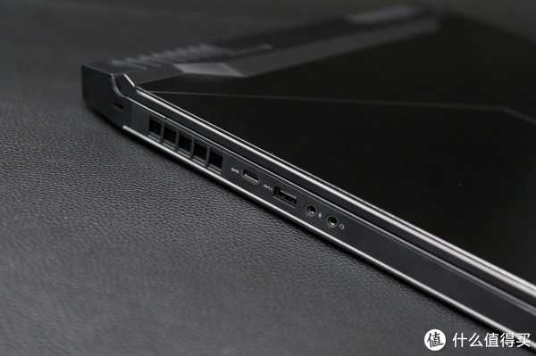 笔记本接口比较丰富,侧面是一些常用的数据、音频接口,比较大的不经常使用的接口都设计在了笔记本后部。左侧面分别是Type-C接口、USB3.0接口(可供电)、3.5mm麦克风、3.5mm音频输出接口(接口可更改设定变为麦克风输入或者音频输入)。同时散热口也出现了,无处不在的散热。