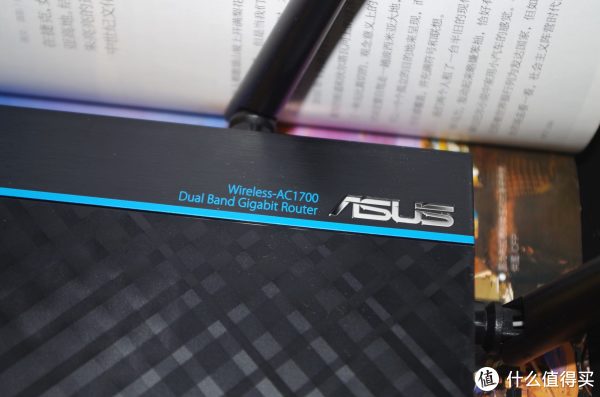 ▲RT-ACRH17本体图,很像RT-AC1200、66UB1(三天线)?嗯啊..区别就是多了一条蓝带——代表支持MU-MIMO.4条天线不可拆卸。表面还是类似碳纤维那种交叉反光花纹。前方与侧方没有USB 接口