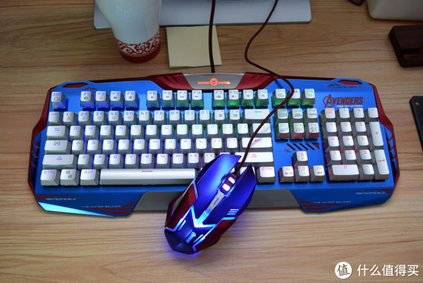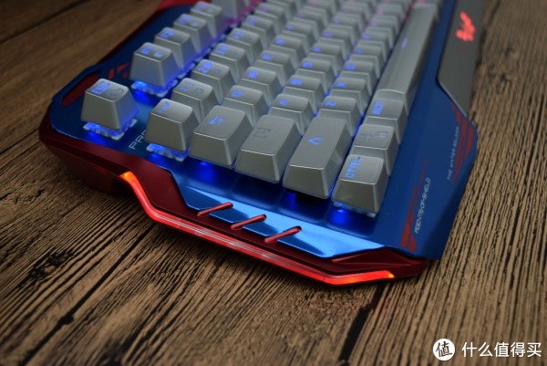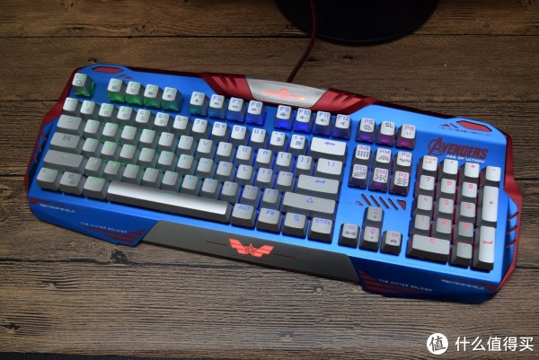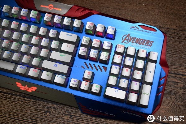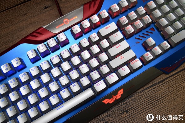 将美队配色很好的融入到键盘当中,经典的红蓝配色,甚至连键帽都重新定制,个性的侧边,RGB灯光,可以看到还是挺用心的。外观颜值上很是满意。