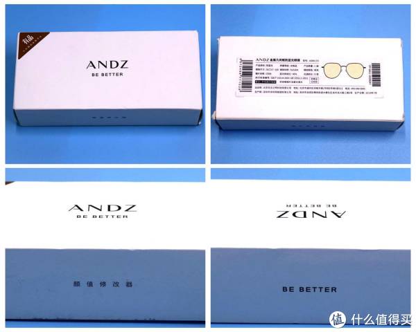 这款眼镜是在小米有品上开售的,所以包装的风格,延续了小米有品的经典风格。白色的包装盒上,有着产品标志【ANDZ BE BETTER】,左上角有小米有品的角标。背面有产品的一些参数,镜架尺寸:55mm□17mm-150mm,镜架的材质:SUS304,镜架颜色:枪色,镜片材质:CR39,蓝光吸收比:46%,光投射比:0类。包装侧面的这个“颜值修改器”,让人对这款产品充满了期待。