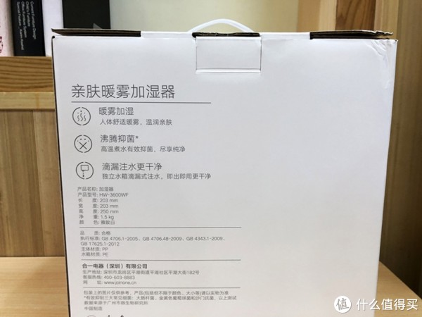 在包装盒的背面则是罗列着加湿器的主要特点、基本参数以及产品规格等。