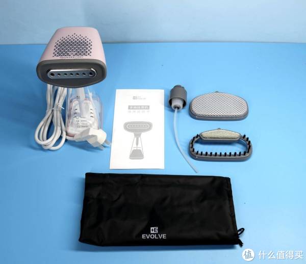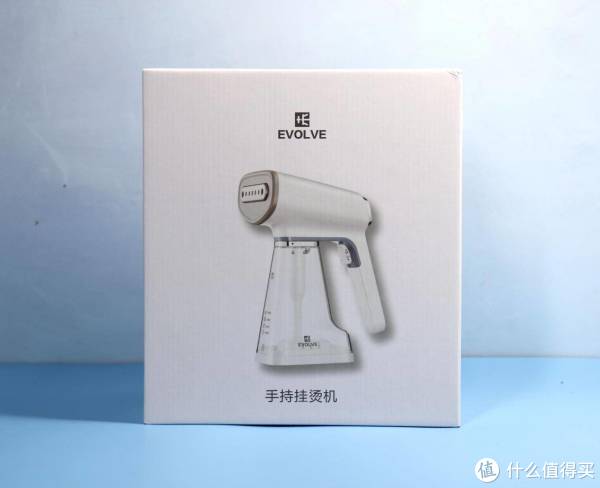 整体的包装风格很简洁,正面是产品图,侧边有产品的一些参数和介绍。包装上有品牌的LOGO“EVOLVE”和产品名“手持挂烫机”。