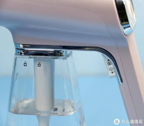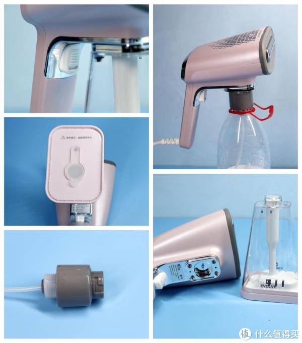 这是细节的部分,衣未手持挂烫机底部有加水口盖,可以从底部加纯净水使用。瓶子连接器也是非常实用的,可以连接矿泉水瓶进行使用。出差的人不需要带水箱,直接连接到矿泉水瓶上就能够使用了。在水箱上有标示拧开的方向,蒸汽按钮上也有蒸汽的图示,使用时只需要看图示即可。