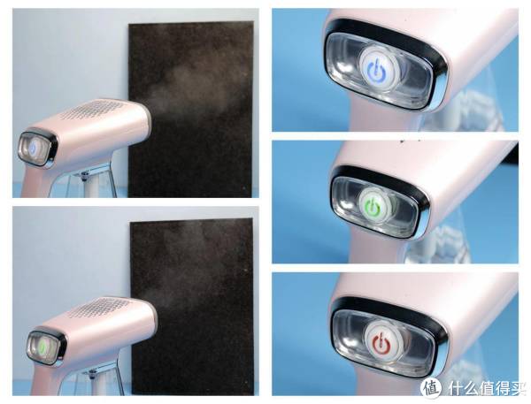 有两个档位可供选择,蓝色灯光是一档强劲蒸汽,这个档位的蒸汽量大。绿色灯光是二档柔和蒸汽,蒸汽量会比一档小一些,红色灯光是停止状态,上图也有两个档位的对比。预热时间40S,开机之后会有一个预热的过程,灯光是闪烁状态,等灯光常亮之后即可使用。