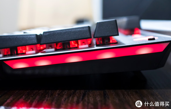 键盘左右侧面还有两组红色的灯条,灯光亮度跟随LOGO灯的调节与关闭,更多的是对键盘左右侧环境氛围渲染,从使用效果上来说,由于亮度方面并不算高,只能在暗光环境下灯条装点下桌面。