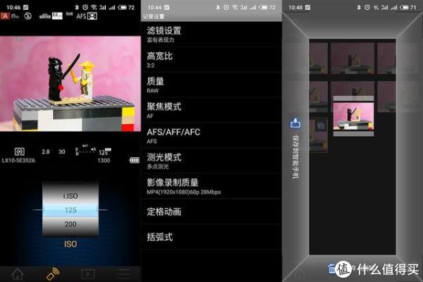 相机的感光度在125以上,详细设置里有滤镜、高宽比、对焦方式、测光模式,在回放视窗里长按图片可以保存到手机或删除整体体验比较完善,无需复杂的操作。