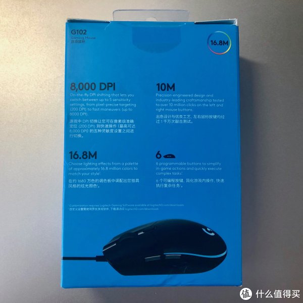 · 由于产品定位原因,G102的包装并不是常见的黑底+产品图片的组合。而是将黑底换成了蓝底,同时内部也没有更加高级别产品的塑料托盘。包装盒背面写着产品的4大亮点:最高8000DPI、主键一千万次点击寿命(罗技的寿命看看就好)、1680万色RGB加成以及6个可编程按键。