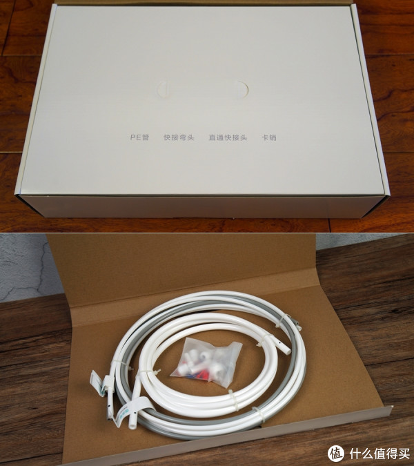 ▲可使用随机配件包内的90度弯角快接头直接插入,这台净水器除了自来水是用三分PE管外,其它都采用两分PE管