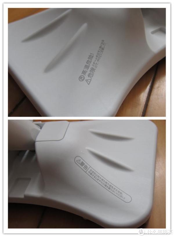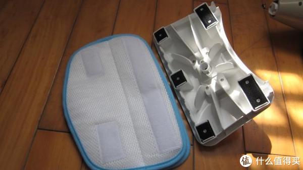 地耙通体雪白,材质采用塑料磨砂处理,手感很好;中间是与主机的连接杆,可以前后移动;两侧印有警示语,主要是高温蒸汽危险;底部四周设计有5块魔术贴,可以与清洁布有效粘贴,中间是高温蒸汽出口,蒸汽释放到清洁布中达到辅助处理污渍的效果。