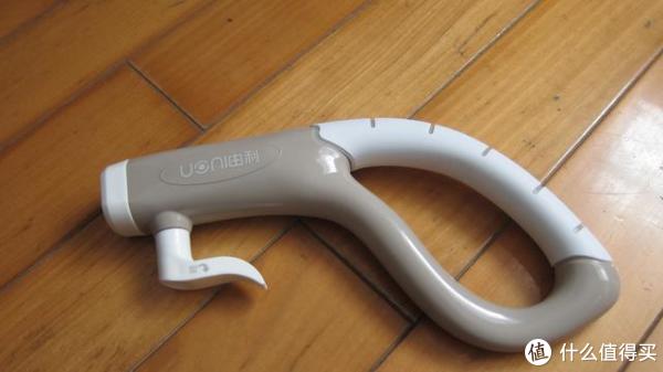手柄印有由利品牌LOGO,握手处设计有白色硅胶区别于光滑的塑料,增加了摩擦力和握手舒适度,下方白色旋钮则是挂线夹,方便电线悬挂。